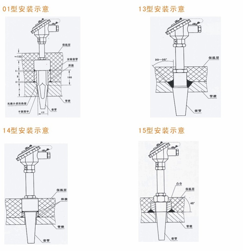 用于测量蒸气管道及锅炉的温度。它有五种不同结构和安装方式,用户可根据不同的蒸汽温度、压力及流速来选用。